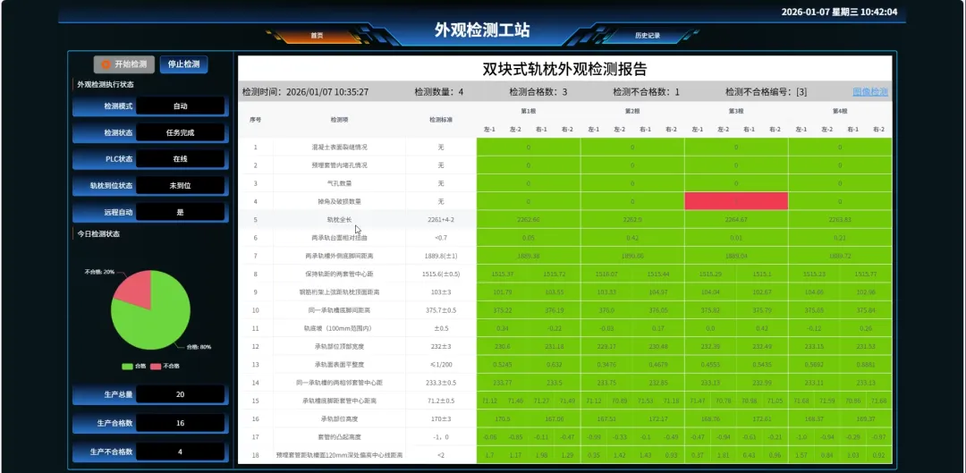 视觉检测技术实现轨枕三维尺寸扫描,自动评判质量并生成报告,实时生成检测报告及自动喷码,确保每根轨枕信息可追溯。
