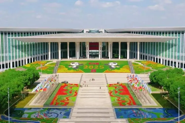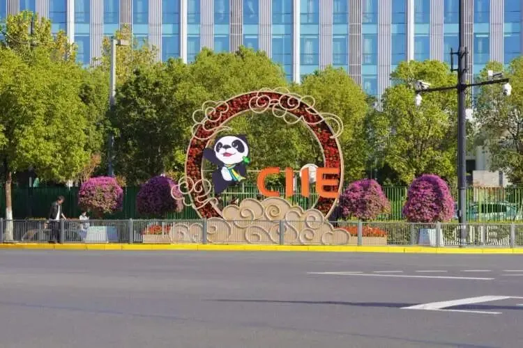 绿化景观还有夜景效果,今年优化了灯光布局,全面提升夜间景观的视觉效果与艺术表现力,新增CIIE字样光效与射树灯,在夜幕中营造出“火树银花”的盛景。