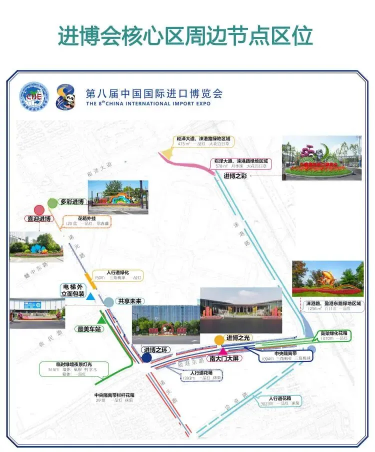 进博会内场景观包括南广场及西厅景观。外场覆盖场馆周边14公里范围,北至崧泽高架、西临诸光路、南抵盈港路、东濒涞港路,包括地面草花与三角梅更换、灯光与大屏幕设施维护等,以及6处主题景点布置。