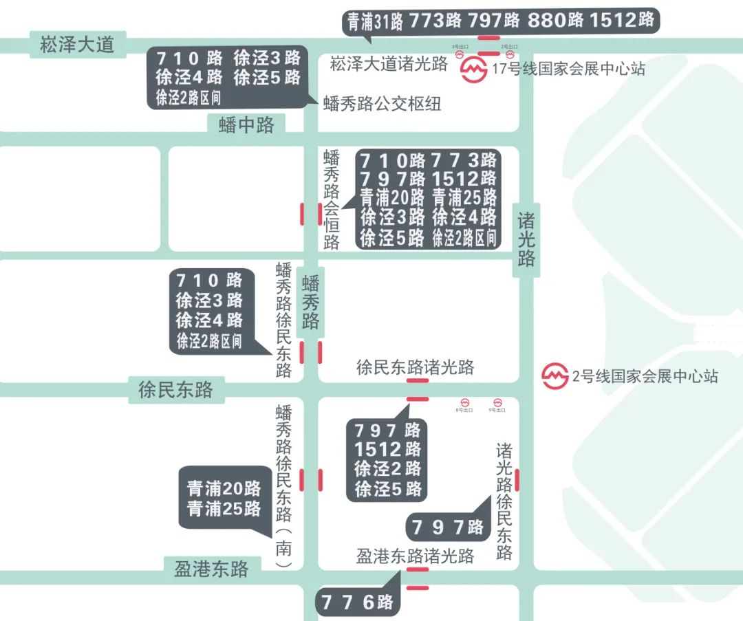 夏都小镇(沪青平公路蟠龙路公交站)、上海大虹桥灿辉希尔顿酒店(沪青平公路明珠路公交站)、徐泾镇商业中心(明珠路育才路公交站)、万科天空之城(崧泽大道徐盈路公交站)