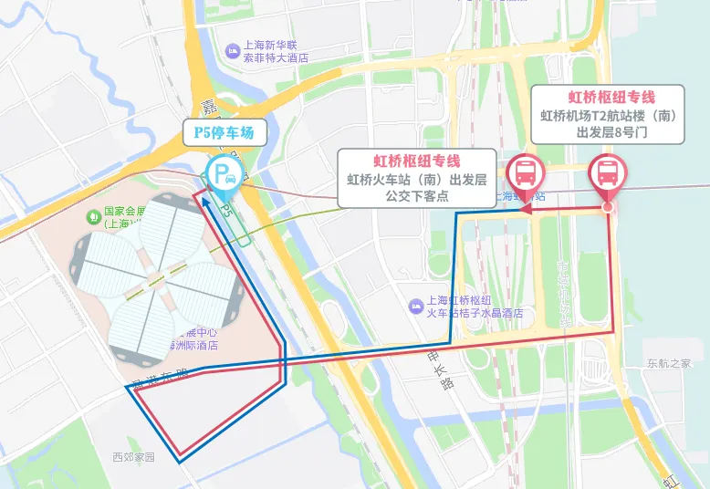 展会期间,在 P5停车场内设置4条进博会接驳专线,分别开往虹桥机场T2航站楼、虹桥火车站;轨道交通9号线中春路站、七宝公交站、轨道交通12号线七莘路站;轨道交通13号线金运路站;以上三条线路在离场时段(15时至20时)运行。另一条开往徐泾镇全日(8时至20时)运行。