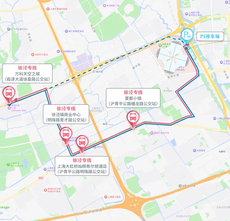 徐泾镇商业中心(明珠路育才路公交站)、上海大虹桥灿辉希尔顿酒店(沪青平公路明珠路公交站)、夏都小镇(沪青平公路蟠龙路公交站)、P5停车场