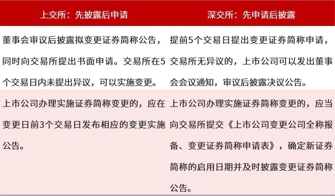变更证券简称需要经过交易所批准实施,但沪深两所在申请程序上有所不同: