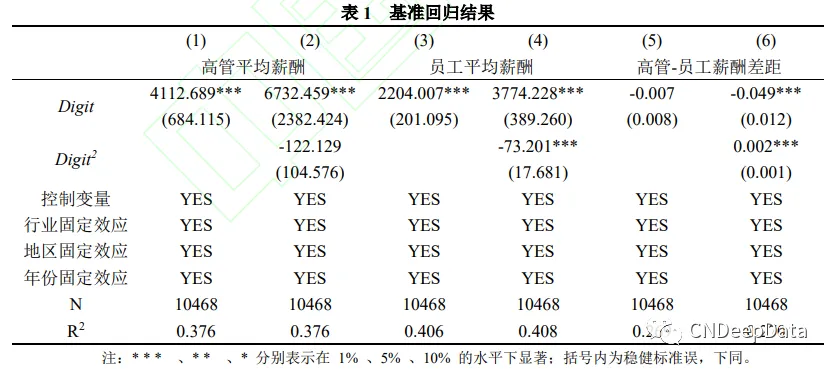 其中,v 是反映 Y 分布的统计量,Y、Digitit-1、Xit-1 等变量的定义和衡量方法 与模型(1)保持一致。本文使用了方差和分位数两种统计量,前者可以反映薪 酬的整体变化程度,后者能够反映不同分位数上薪酬的变化程度。