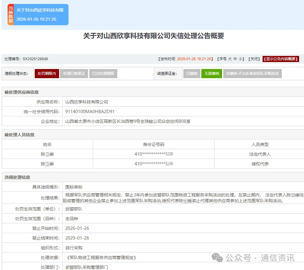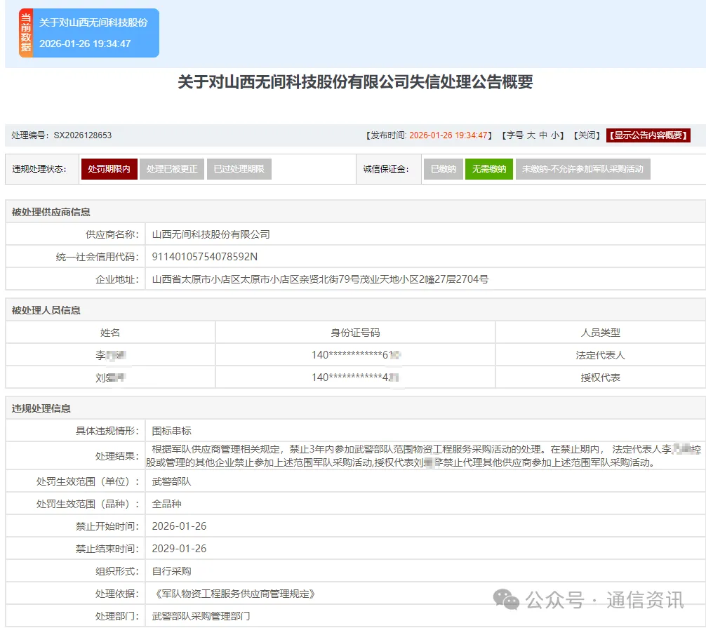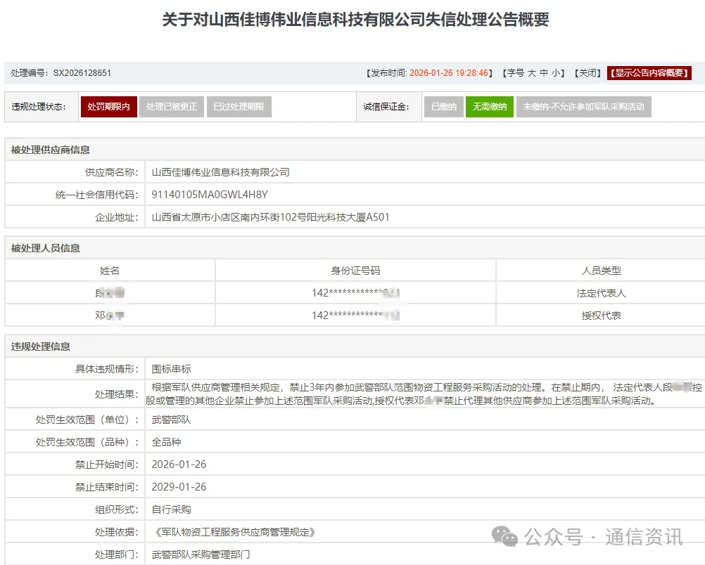 具体违规情形:围标串标;处罚生效范围(单位):武警部队;处罚生效范围(品种):全品种;禁止开始时间:2026-01-26;禁止结束时间:2029-01-26;处理依据:《军队物资工程服务供应商管理规定》;处理部门:武警部队采购管理部门。