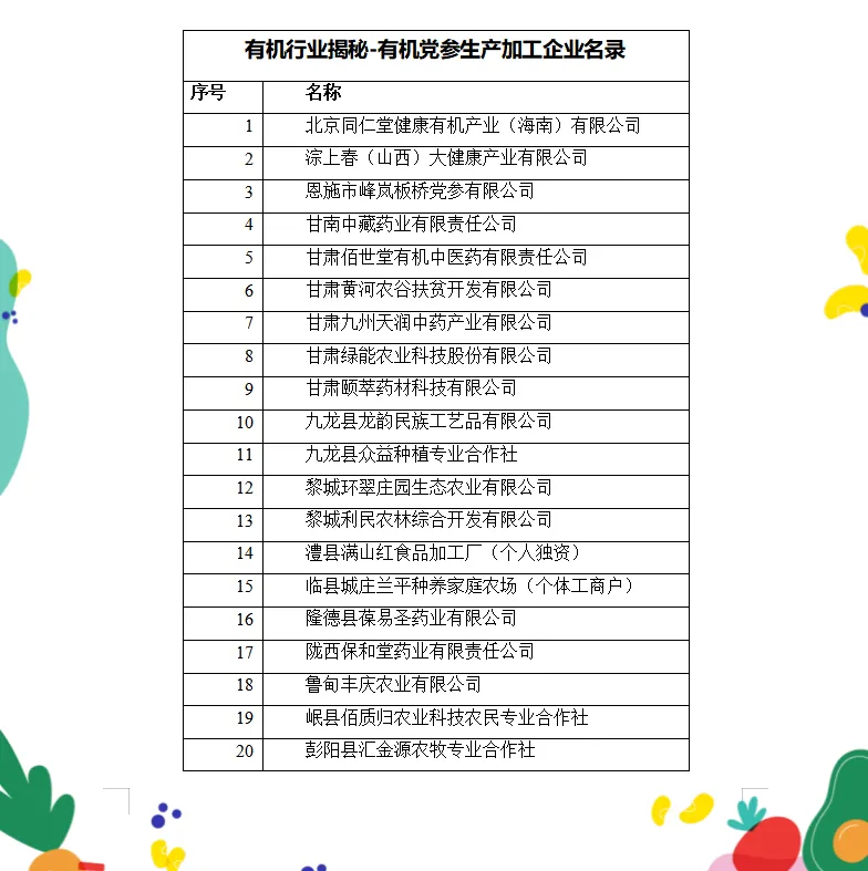 党参作为食药同源物质,产业正处于由绿色、标准化种植快速向有机化、全产业链升级的发展阶段,产业链已从传统的中药饮片,延伸至食品饮料(固体饮料、食品配料)、化妆品等多个领域。目前,经过中国有机认证的党参生产加工企业共有29家,具体如下: