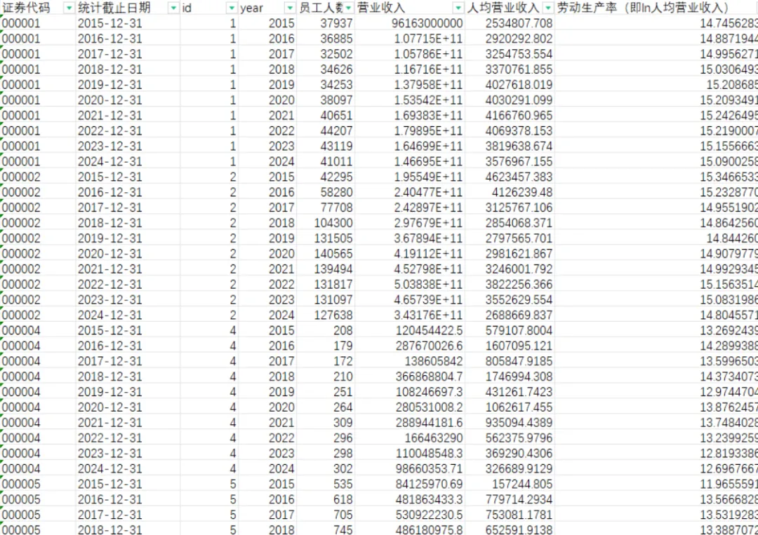 数据来源:上市公司企业数据 数据格式:Excel 参考文献:参考《管理世界》牛志伟(2023)老师的研究,使用企业单位劳动力产出(人均营业收入)的对数值,测度企业劳动生产率. 数据指标:
