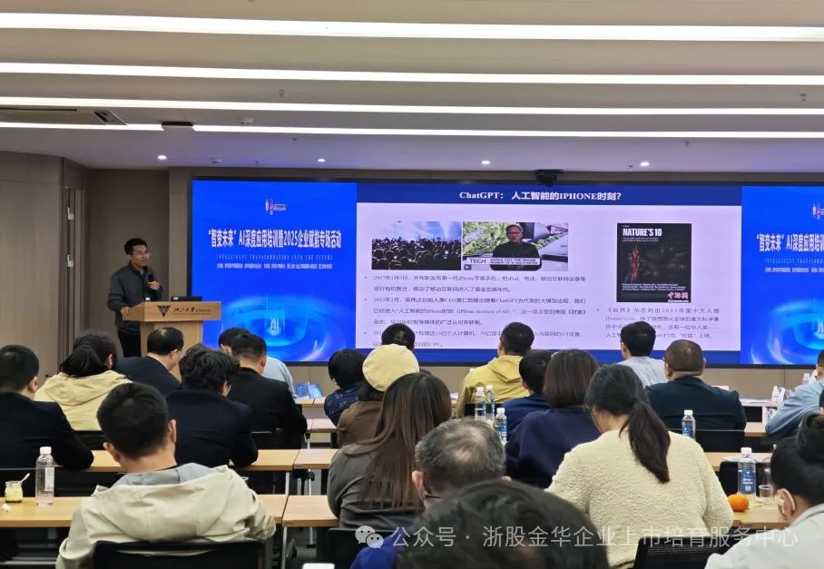 为助力企业深入理解人工智能技术,探索AI赋能产业升级的实践路径,2025年3月25日 ,由金华市资本市场发展促进会、金华市高新技术企业协会主办,浙股(金华)企业上市培育服务中心、浙江大学金华研究院协办的“智变未来”AI深度应用暨2025企业赋能专场活动在金华之心成功举办,吸引了来自金华各地区的六十余家企业百余人参加,共同探讨AI技术的前沿趋势。