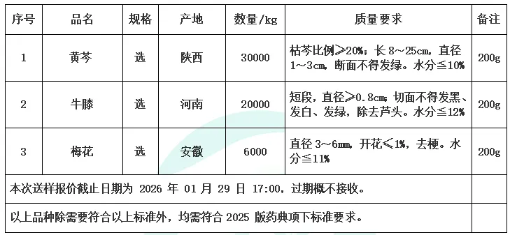 1、采购原则以“道地产区、符合GAP或趁鲜加工资质的供应商为优先选择对象”;若招标文件中已明确产地要求,不符合产地要求的投标将被视为无效投标。