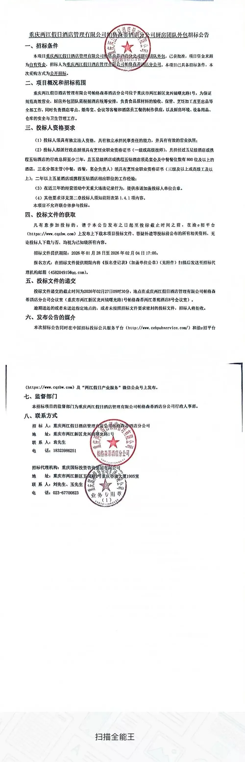 重庆两江假日酒店管理有限公司帕格森蒂酒店分公司厨房团队外包公告