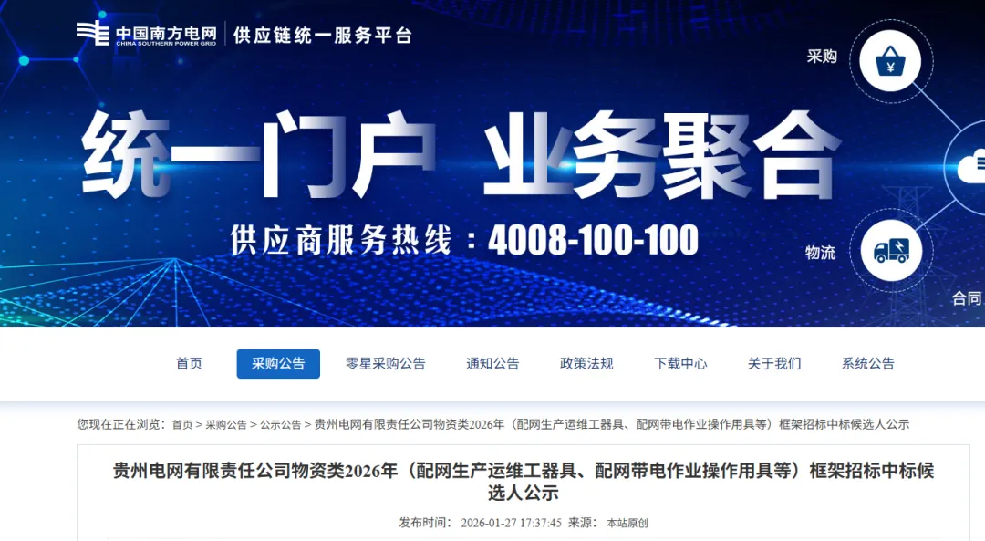 贵州电网有限责任公司物资类2026年(配网生产运维工器县、配网带电作业操作用县等)框架招标中标候选人公示