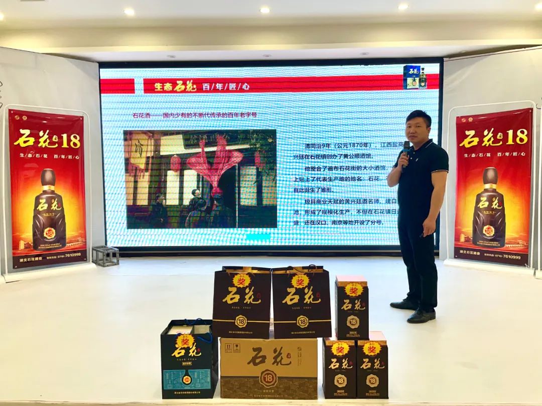 襄阳城区年份高端酒主管楚仁山为嘉宾讲解了《高端年份酒》品牌PPT。来宾们通过讲解更加了解了石花酒业的发展历程、取得的荣誉和石花酒的华夏酒祖、楚国宫廷酒、霸王出征酒等“十二种身份”以及始终坚守的“甜心水、放心粮、红心曲、匠心酿、真心藏”的“五心级”酿造标准。