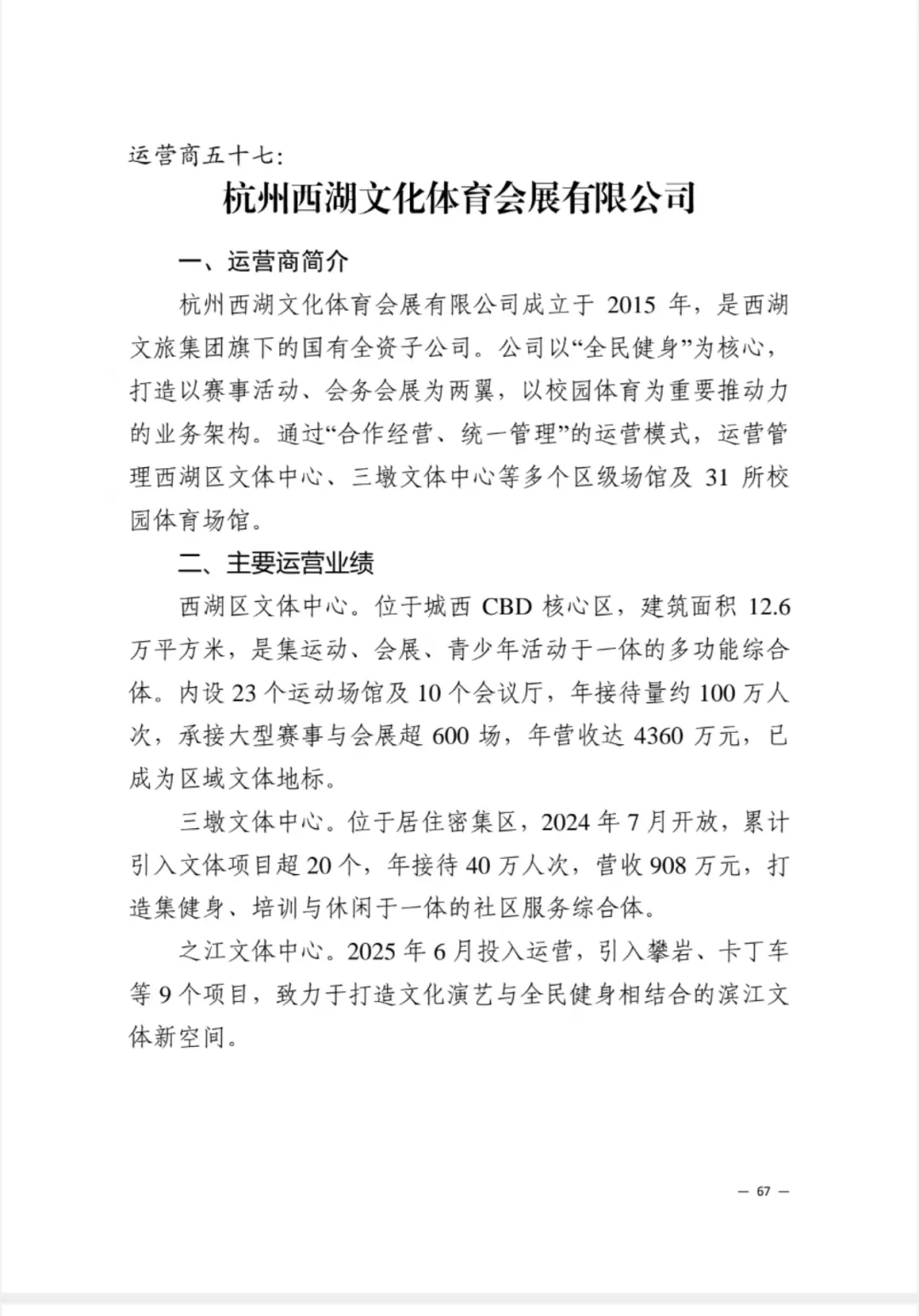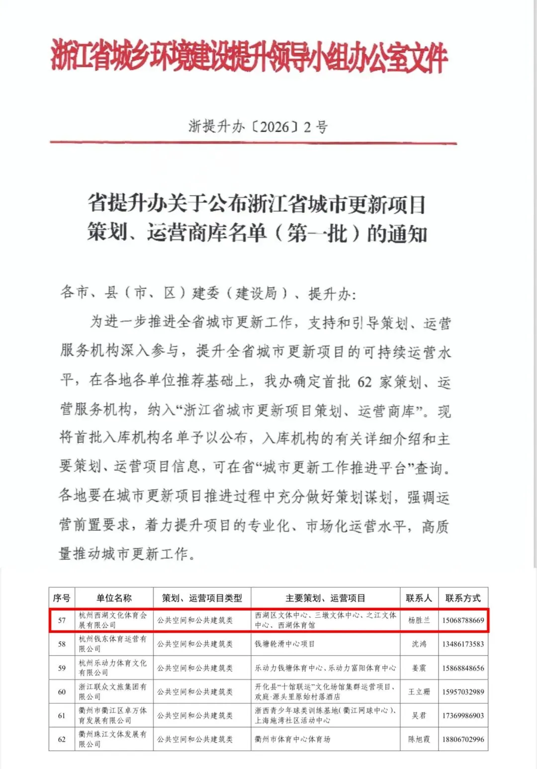 近日,省提升办公布首批浙江省城市更新项目策划、运营商库名单,西湖文旅集团旗下文体会展公司,凭借西湖体育馆、西湖区文体中心、三墩文体中心、之江文体中心“一馆三中心”的运营案例,以及在普惠化全民健身服务供给、“体育+”服务综合体创新打造、数字化智慧场馆建设的实践成果,成功入选。