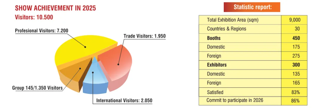 上届展会4个展厅共展出总面积达9000m2,展位550个。展会吸引了来自越南、中国、印度、波兰、孟加拉、比利时、加拿大、德国、捷克、荷兰、韩国、美国、香港、印度尼西亚、伊朗、以色列、俄罗斯、马来西亚、新西兰、日本、巴基斯坦、芬兰、新加坡、泰国、瑞典及中国台湾等30个国家及地区共450家公司和代表参展。据主办方展后调查显示: 83.8%的展商表示对参展成果十分满意,其中89%展商表示继续参展加下年度展会。