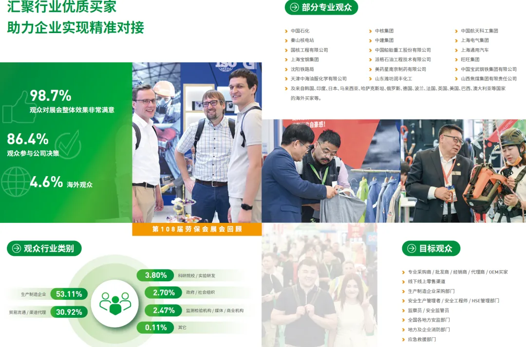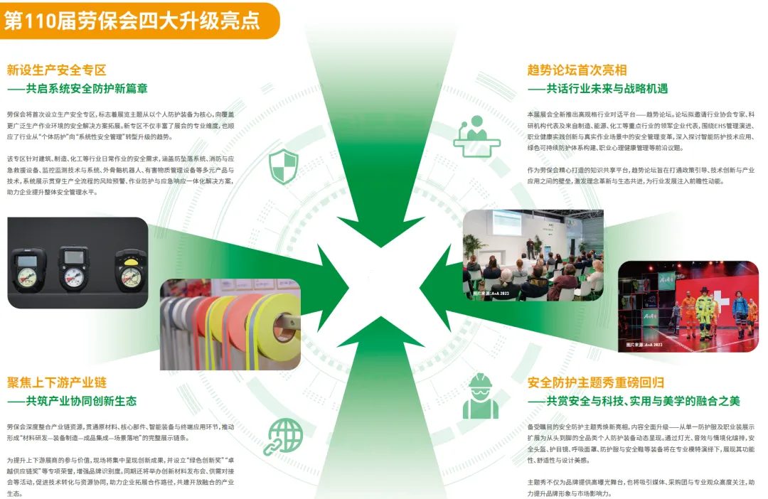 历经50余载的劳保会,持续注重个体安全防护和安全生产,旨在为企业与企业、企业与行业、企业与政府、企业与院校、企业与市场之间搭建更广阔的信息共享平台。在为全球防护产品生产者和使用者搭建重要贸易及交流平台的同时,全面提升中国劳保行业蓬勃发展的脚步,让民族品牌在赢得世界赞誉的宽阔道路上不断前行。