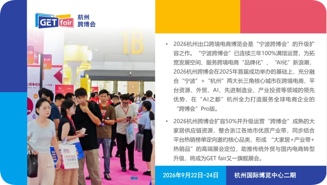 2026杭州跨博会扩容50%并升级运营“跨博会”成熟的大家居供应链资源,整合浙江各地市优质产业带,同步结合平台热销榜单定向邀约核心品类,形成“大家居+产业带+热销品”的高端展会定位,助推传统外贸与国内电商转型升级,将成为GETfair又一旗舰展会。