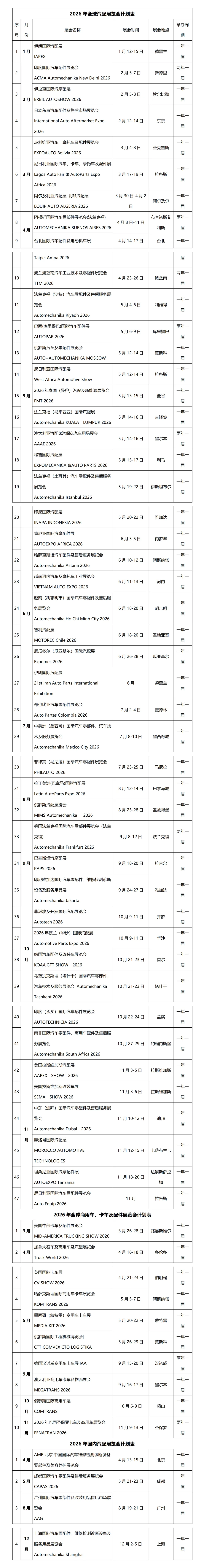 商会动态丨2026年全球汽配展览会计划表