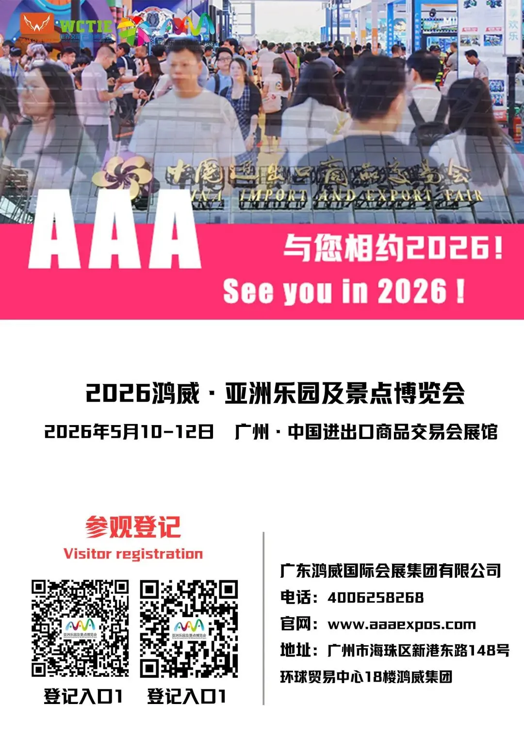 无论您是文旅景区投资方、乐园运营商、跨境贸易商,还是室内娱乐场馆创业者、文商旅项目开发商,在2026AAA展上,都能找到精准适配的资源:从电玩游艺、数字娱乐、大型游乐/景区装备到休闲运动车、露营旅居、文旅灯光,从跨境爆品到定制化解决方案,全产业链、全品类的优质商品与实力展商,将为您的采购需求提供无限可能。