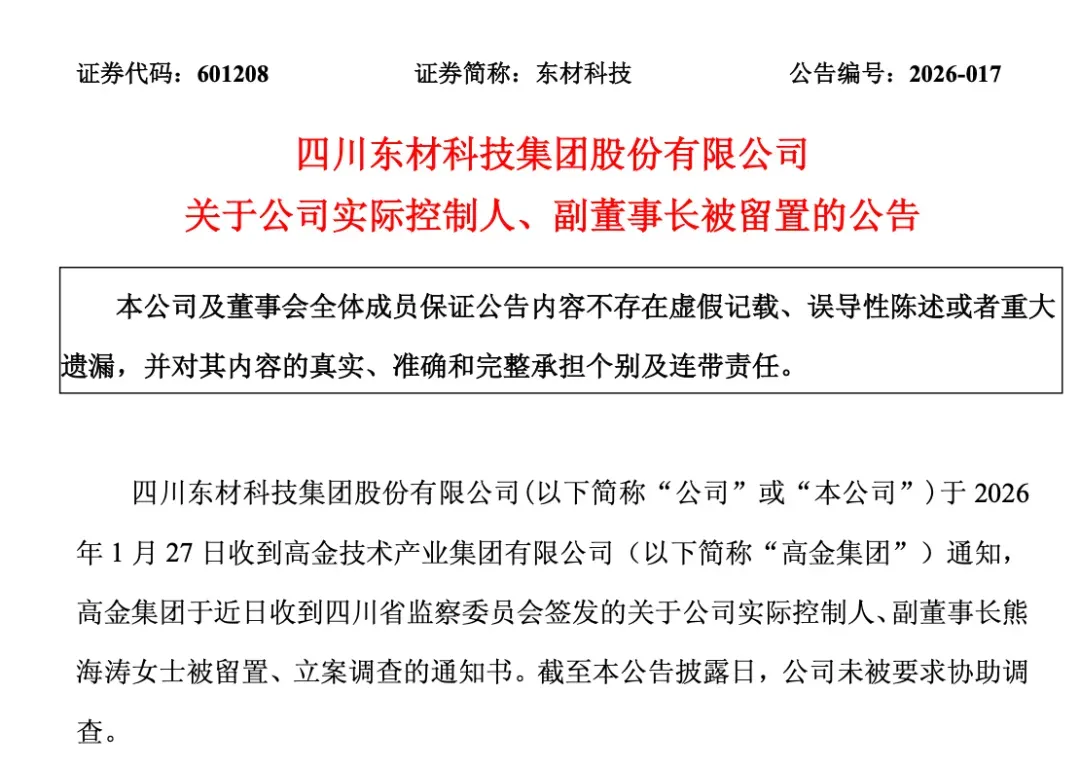 东材科技称,公司于2026年1月27日收到高金技术产业集团有限公司(下称“高金集团”)通知,高金集团于近日收到四川省监察委员会签发的关于公司实际控制人、副董事长熊海涛被留置、立案调查的通知书。截至公告披露日,公司未被要求协助调查。
