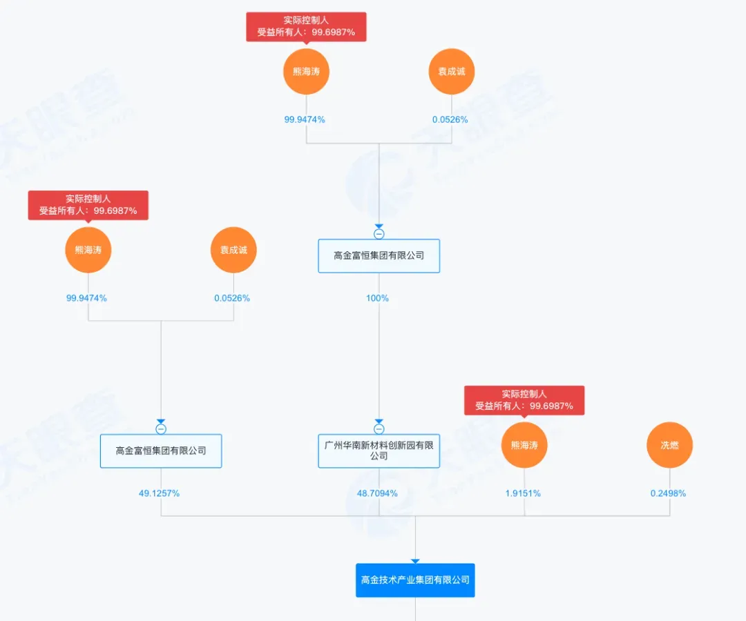 天眼查显示,东材科技、毅昌科技、高盟新材三家上市公司的第一大股东均为高金技术产业集团有限公司。实际控制人同为熊海涛。