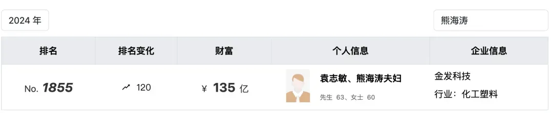 2024年3月25日,胡润研究院发布《2024胡润全球富豪榜》,袁志敏、熊海涛夫妇以135亿财富位列榜单第1855位。