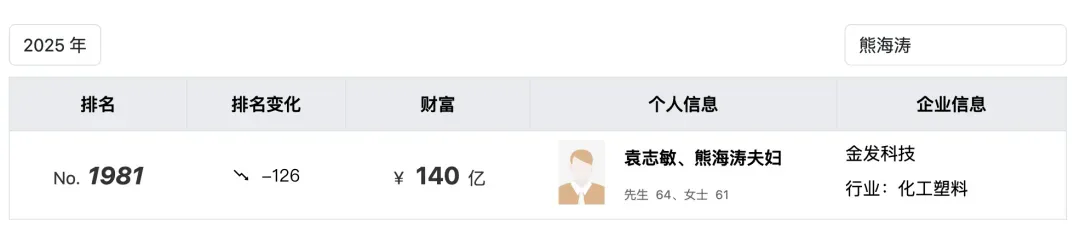 2025年3月27日,胡润研究院发布《2025胡润全球富豪榜》,袁志敏、熊海涛夫妇以140亿财富位列榜单第1981位。