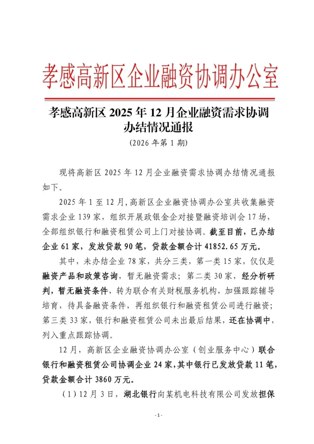2025年1至12月,高新区企业融资协调办公室共收集融资需求企业139家,组织开展政银金企对接暨融资培训会17场,全部组织银行和融资租赁公司上门对接协调。截至目前,已办结企业61家,发放贷款90笔,贷款金额合计41852.65万元。