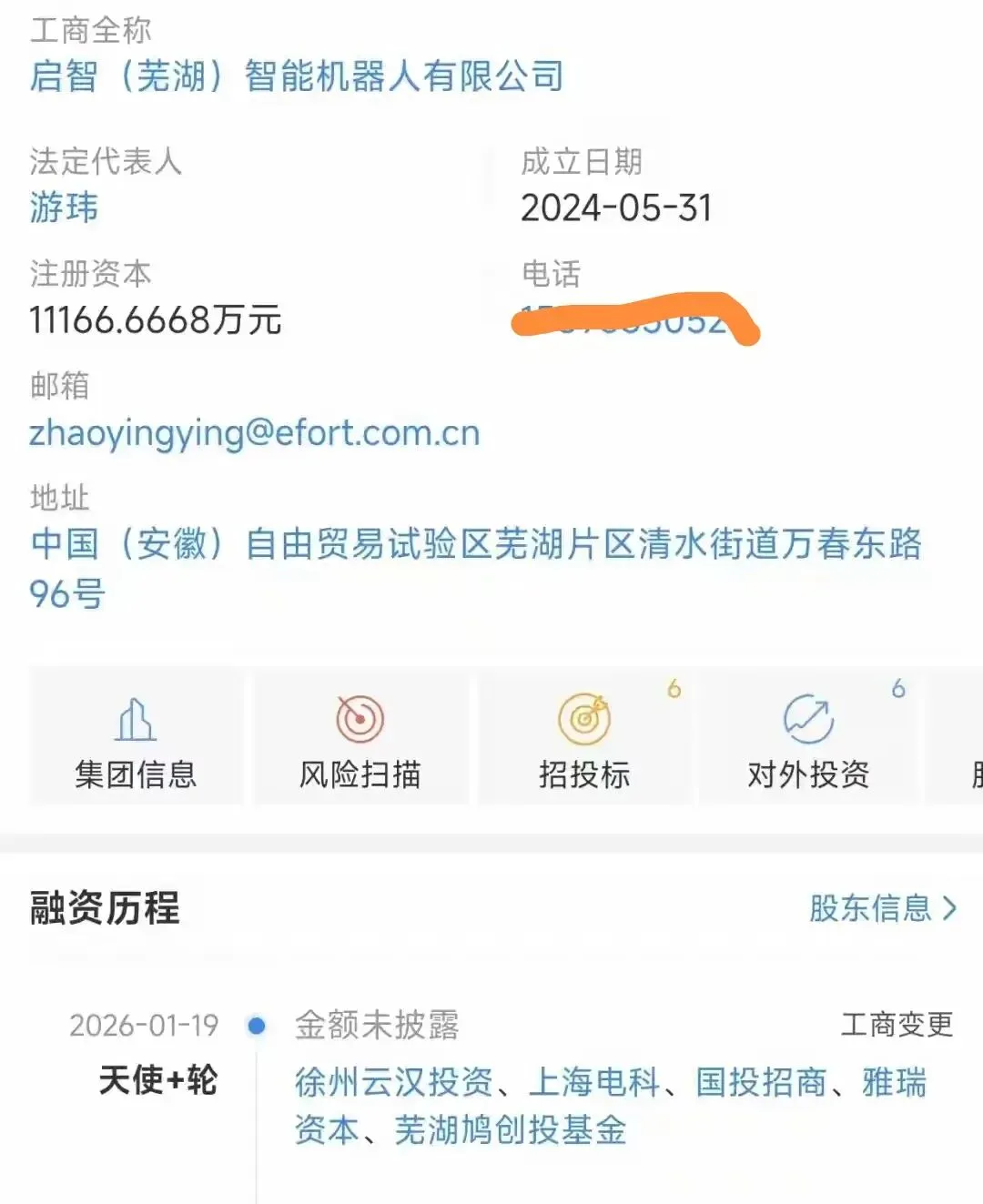 天眼查App股权信息显示,启智智能由启智(芜湖)科技有限公司控股,持股比例53.7313%,后者由埃夫特智能机器人股份有限公司持股51%,芜湖科创投资基金有限公司持股49%。
