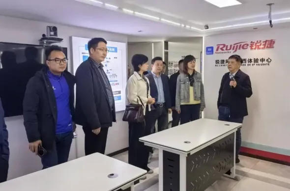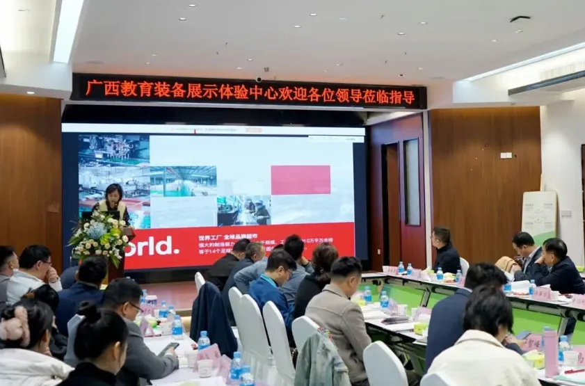 随后,参观团走进广西教育装备展示体验中心。作为广西教育装备行业协会搭建的政企校沟通平台,该中心聚焦教育行业前沿科技产品,内设校园服饰文化展厅、人工智能互动区、智慧教育体验区等多个功能板块。参观团沉浸式体验了智能书法学习、智能分频广播系统等智慧化软硬件设施,了解AI与教育教学融合的常态化应用范式。