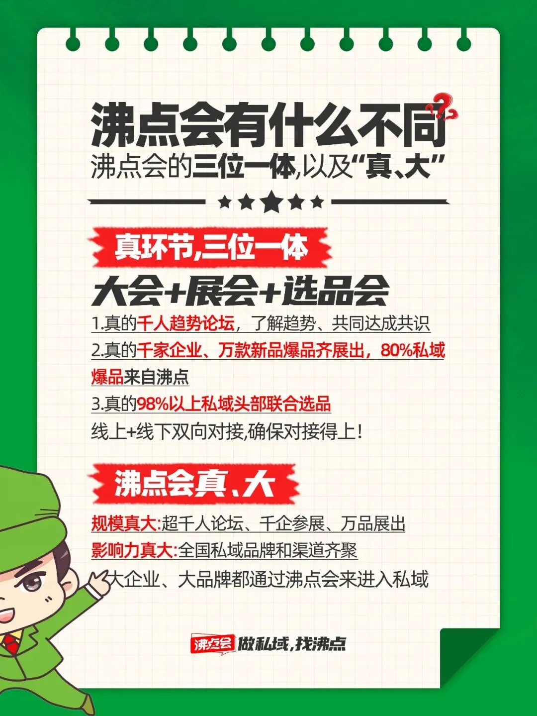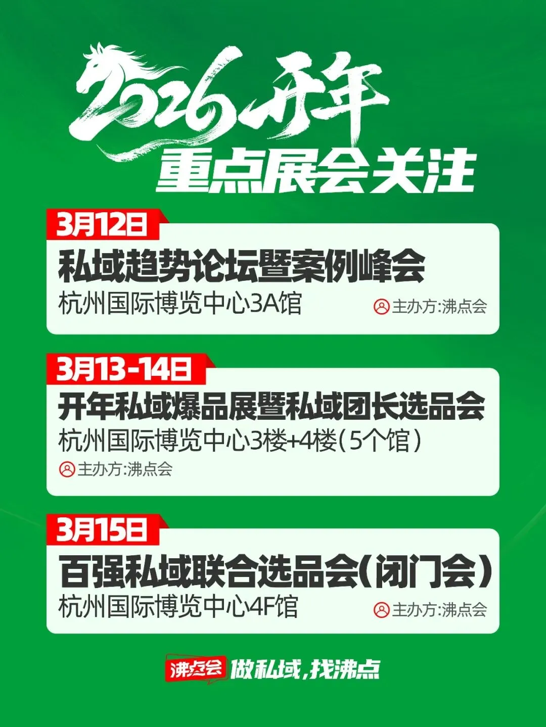 主题:私域破局・新品增长(开年选爆品,就来沸点会) 时间:会议 3 月 12 日,展览 3 月 13-14 日,精准对接 3 月 15 日 地点:杭州国际博览中心(杭州市萧山区奔竞大道 353 号) 主办:沸点会展(广州)有限公司 规模亮点:5 万㎡场地、1000 + 展商、10000 + 新品爆品、98% 私域头部渠道到场
