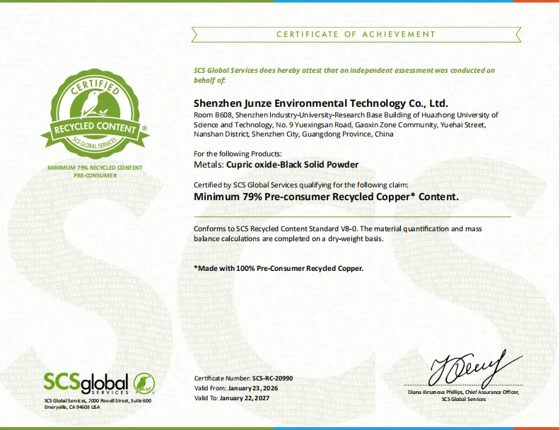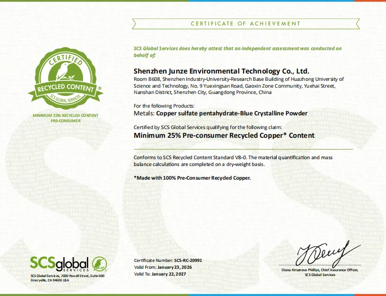 2026年1月28日,深圳骏泽环境科技有限公司传来重磅喜讯——其PCB蚀刻废液资源化再生氧化铜、硫酸铜产品成功通过SCS翠鸟认证,成为行业首家实现100%PCB蚀刻废液资源化再生利用认证的企业,用硬核技术改写行业绿色标准!