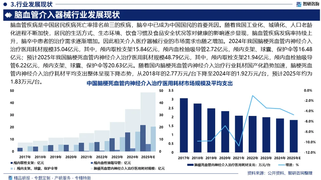 脑血管介入器械为脑血管介入手术中所需的医用耗材。脑血管疾病是中国居民疾病死亡率排名前三的疾病,脑卒中已成为中国国民的首要死因。随着我国工业化、城镇化、人口老龄化进程不断加快,居民的生活方式、生态环境、饮食习惯及食品安全状况等对健康的影响逐步显现,脑血管疾病发病率持续上升,脑卒中患者的治疗需求逐渐增加。因此相关介入医疗器械行业的市场需求也随之增加。2024年我国脑梗死血管内神经介入治疗医用耗材规模35.04亿元,其中,颅内取栓支架15.84亿元,颅内血栓抽吸导管2.72亿元,颅内支架、球囊、保护伞等16.48亿元;预计2025年我国脑梗死血管内神经介入治疗医用耗材规模48.79亿元,其中,颅内取栓支架21.94亿元,颅内血栓抽吸导管6.22亿元,颅内支架、球囊、保护伞等20.63亿元。