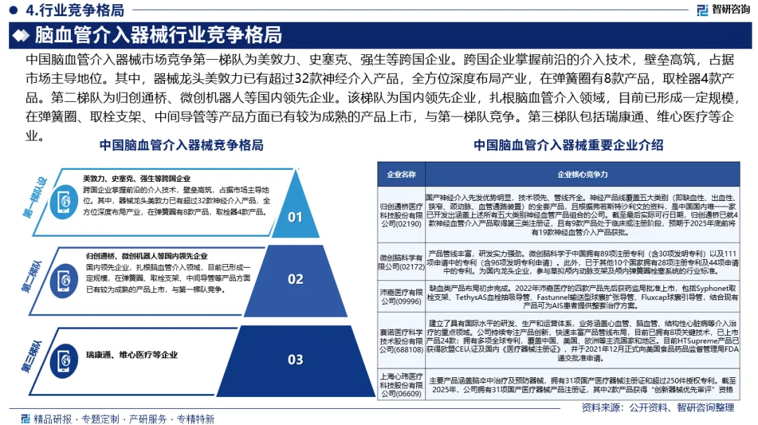 中国竞争情况:中国脑血管介入器械市场竞争第一梯队为美敦力、史塞克、强生等跨国企业,占据高端市场主导地位。第二梯队为归创通桥、微创机器人等国内领先企业。该梯队为国内领先企业,扎根脑血管介入领域,目前已形成一定规模,与第一梯队竞争。第三梯队包括瑞康通、维心医疗等企业。