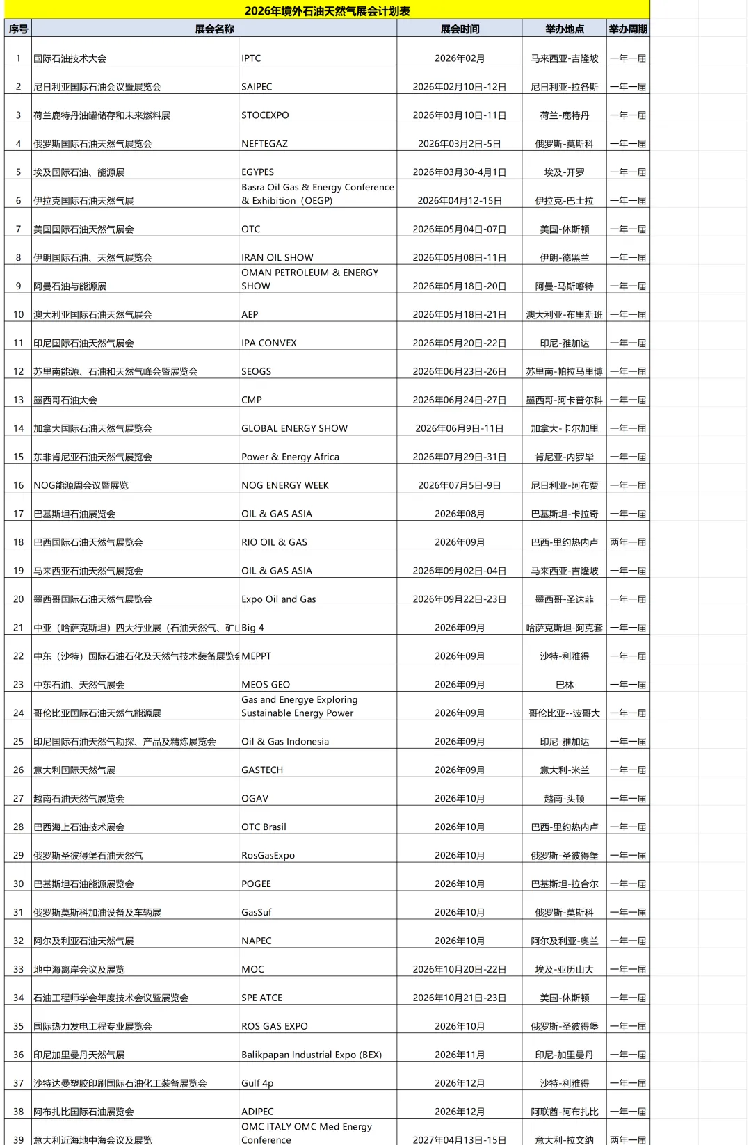 2026年境外石油天然气展会计划表