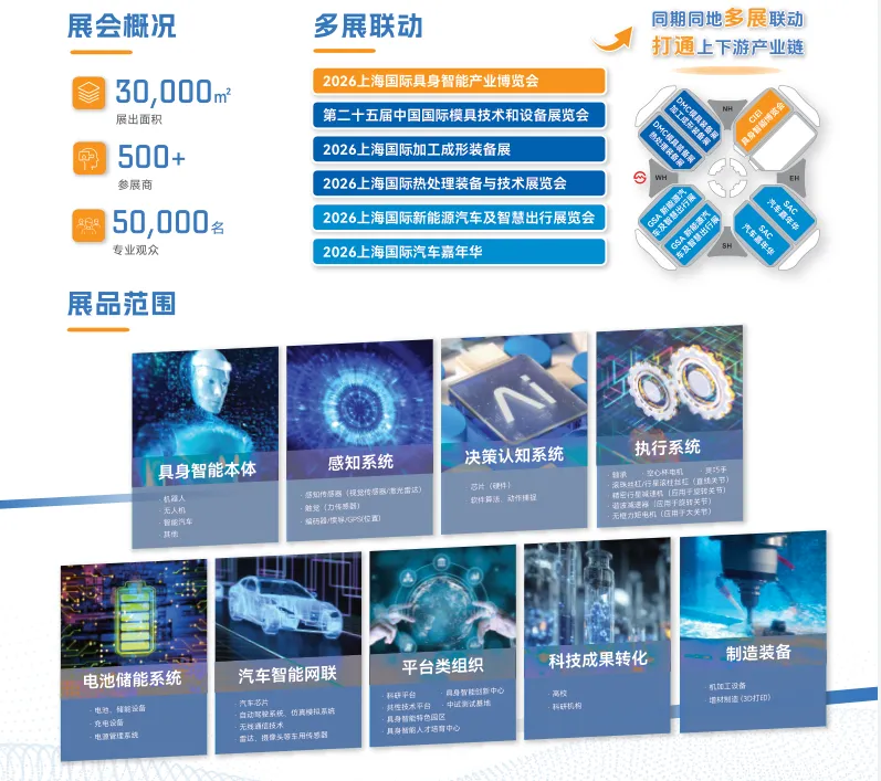 “十五五” 规划建议将具身智能列为前瞻布局的未来产业,国家发改委系统谋划产业发展,地方层面精准发力:深圳开放 50 个十亿级场景,量化政策为产业发展筑牢根基。国务院发展研究中心研判,2035 年中国具身智能市场规模有望突破万亿元。CIEI2026 以 30,000㎡展出面积、500 + 参展商、50,000 名专业观众的体量,成为承接市场红利的核心载体。展会同期联动第二十五届中国国际模具技术和设备展览会、上海国际新能源汽车及智慧出行展览会等多场行业盛会,打通上下游产业链,实现资源互通与需求精准对接,让政策红利通过展会场景高效转化为产业增长动能。资本热钱精准注入,展会构建 “订单 - 量产” 加速通道政策东风下,资本市场热情高涨。2025 年 1-10 月,具身智能领域融资总额超 500 亿元,直接催生产业质变 —— 国产人形机器人实现规模化量产,企业频获大额订单,“订单驱动量产、量产验证技术” 的良性循环已然形成。CIEI2026 作为 “商业加速器”,为企业铺就成长捷径:定向组织汽车制造、3C 电子、精密医疗等关键领域采购团,助力企业直面精准买家、快速签单;一站式汇聚 300 + 从传感器、芯片到 AI 算法的核心供应商,实现三天内高效完成供应商比选与技术对接;专属资本对接环节让企业对话顶级资本决策层,获取战略投资与核心资源。覆盖装备本体企业、核心部件厂商、主机厂及场景应用方的精准观众画像,进一步强化了展会 “产融对接枢纽” 的核心价值。当前,“大脑 - 小脑 - 身体” 的技术架构已成行业共识,各地政策沿此路径发力,锚定工业制造、医疗康养、智慧服务等核心场景,推动技术落地。CIEI2026 紧密贴合技术演进与政策导向,展品范围全面覆盖具身智能本体、感知系统、软件算法、芯片、执行系统、电池储能、汽车智能网联等全产业链环节,以及多元场景解决方案。同期举办具身智能关键部件论坛、新品发布会等活动,邀请头部企业高层与科学家分享前沿技术趋势,帮助企业校准研发方向。通过 “展品展示 + 技术交流 + 场景对接” 模式,展会加速技术迭代与产品转化,推动产业技术水平整体升级。产业终极竞争在于生态,构建 “技术 - 部件 - 整机 - 场景” 融合创新生态是政策与市场的共同目标。北京、上海等地搭建的仿真、数据、中试平台降低了行业研发成本,而 CIEI2026 以 “超越传统展览的价值新枢纽” 为定位,推动全球产业链资源高效链接。展会通过跨界场景对接会,促成具身智能企业与传统行业龙头碰撞需求、开拓增量市场;依托官方媒体矩阵为参展企业提供千万级流量曝光,提升品牌权威性;专属招聘渠道直达核心人才库,解决企业扩张期人才需求。这种 “政策搭台、展会聚能、科技驱动、资本助力、市场牵引” 的立体生态,正将具身智能锻造为新质生产力核心驱动力。CIEI2026 作为生态融合关键节点,通过全链条资源整合,推动产业从单点突破走向系统升级。政策与资本已推开具身智能产业化大门,CIEI2026 正为这场产业浪潮注入关键推力。