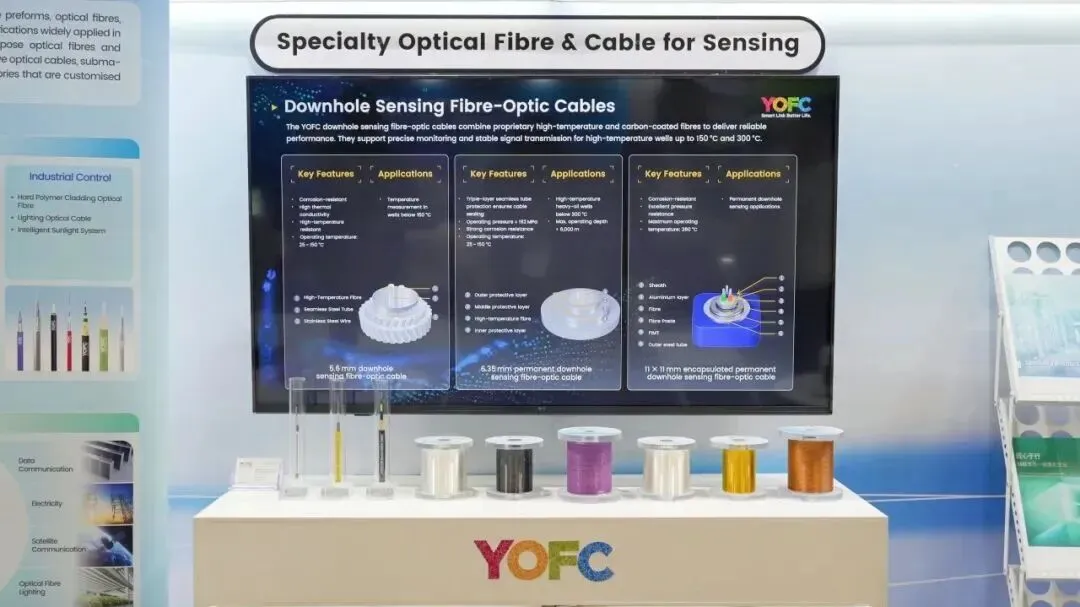 光纤传感方面,公司集中呈现了基于耐高温、碳涂覆、抗辐照等核心技术的系列产品,包括耐高温光纤、水下光缆、油井传感光缆等。