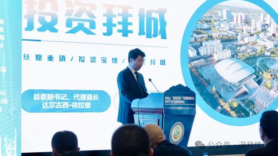 会上,代理县长达尔古西・依拉音介绍了拜城县重点板块、重点项目及招商政策,涵盖文旅康养、矿产矿藏资源、特色农业等多个领域进行了介绍。