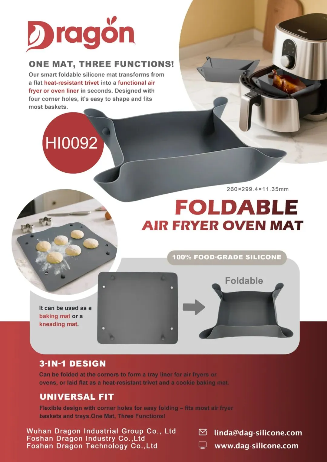 3.可折叠空气炸锅垫,硅胶材质柔韧耐用,集空气炸锅/烤箱托盘衬垫、耐热三脚架、饼干烘焙垫于一体,四角小孔方便折叠固定,省空间且适配多数器具。