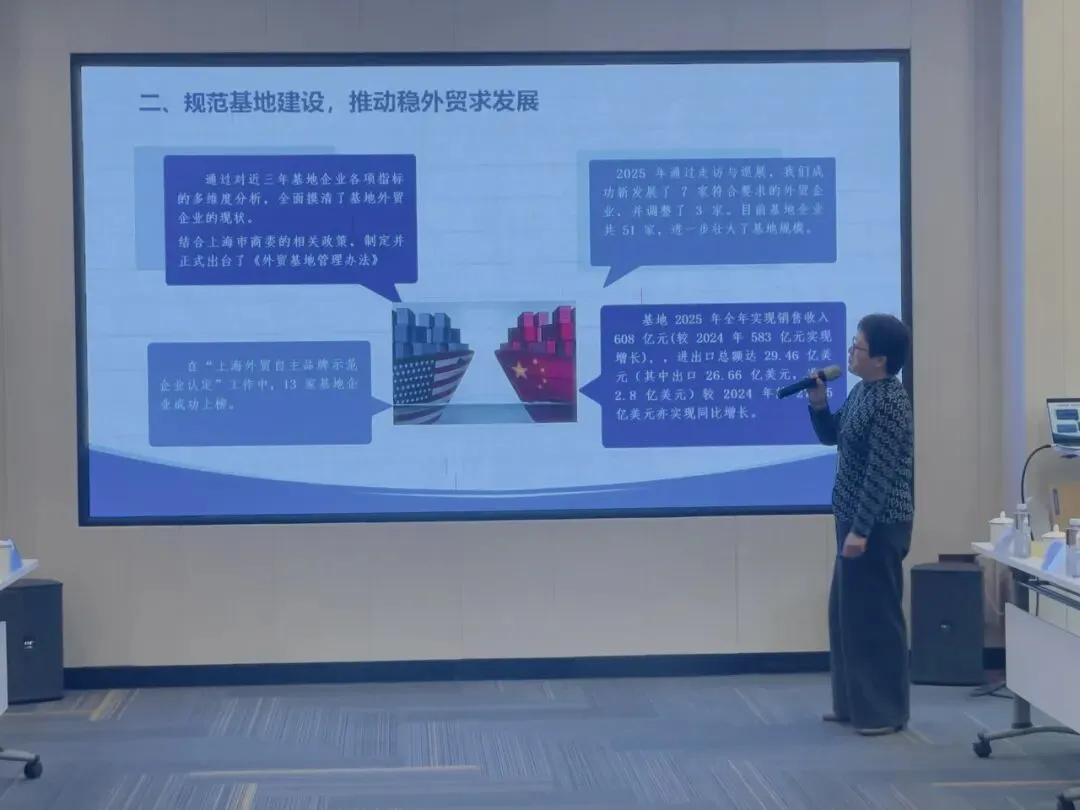 会上,协会副秘书长李爱敏就外贸基地工作情况做作详细报告。多年来,在上海市商委的悉心指导下,协会贯彻“服务企业、赋能行业、助力发展”的宗旨,以政策导向为指引、以专业服务为基石,有效开展服务赋能工作,帮助上海国家外贸转型升级基地(化工)企业抵御外部风险,提升国际竞争力,为上海化工行业“稳外贸”工作提供了坚实支撑。2025年,基地企业数量由2024年的46家增至52家,基地企业销售收入、进出口总额等关键指标均实现同比增长。