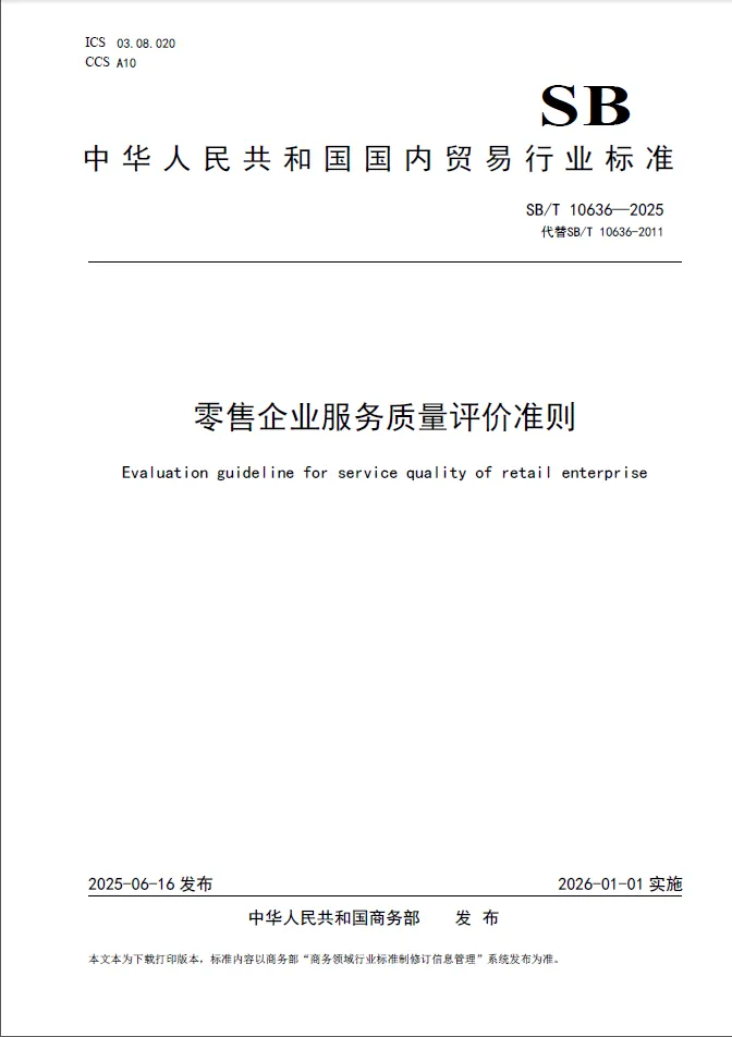 《零售企业服务质量评价准则》行业标准SB/T 10636-2025是由中国商业联合会牵头,联合了新消费(北京)规划院有限公司 、北京市商业联合会 、中国质量认证中心有限公司 、上海万茂网络科技有限公司 、珠海万联智达商业服务有限公司 、天虹数科商业股份有限公司 、王府井集团股份有限公司 、浙江省商贸业联合会等头部企业和机构共同修订完成。标准适用于零售企业服务质量的培训及第三方机构评价,也可用于企业内部改进服务的参考。