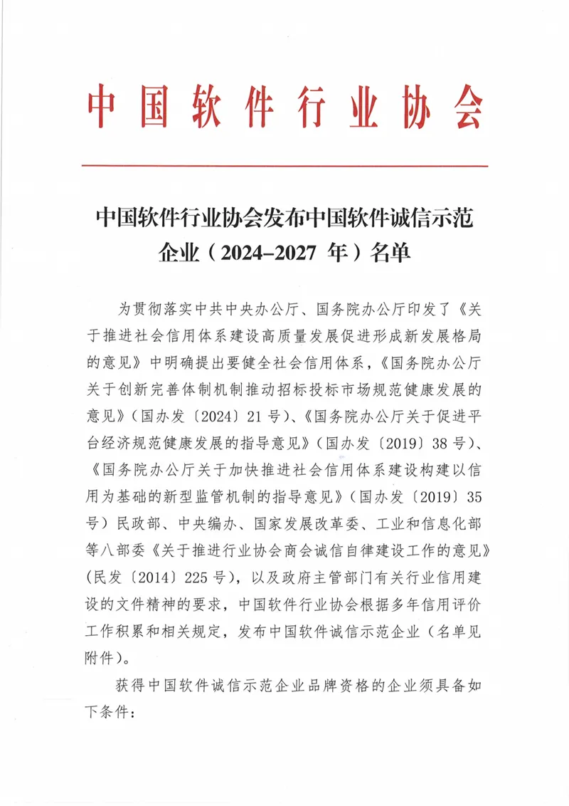 中国软件行业协会发布中国软件诚信示范企业(2024-2027年)名单