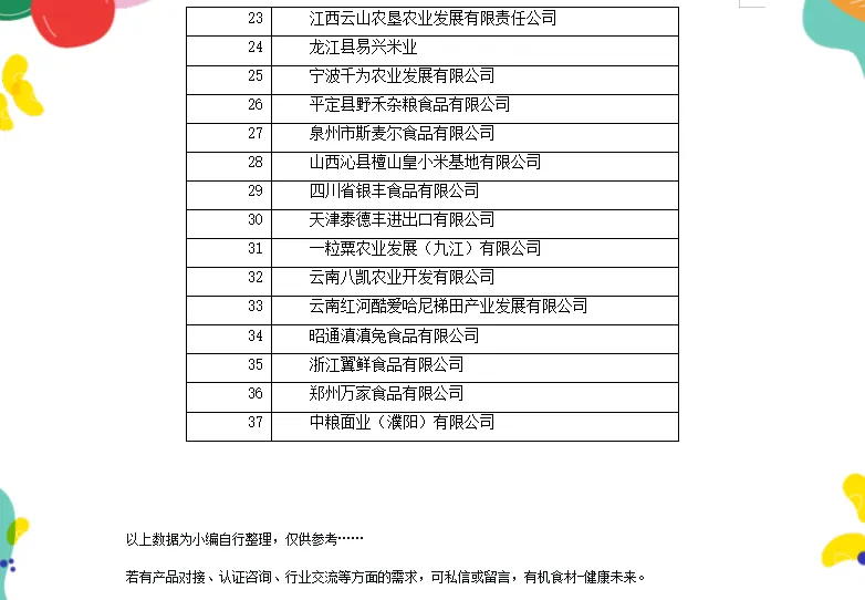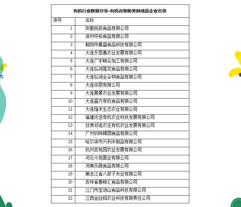 有机食品行业数据分享-有机谷物粉类制成品企业名录