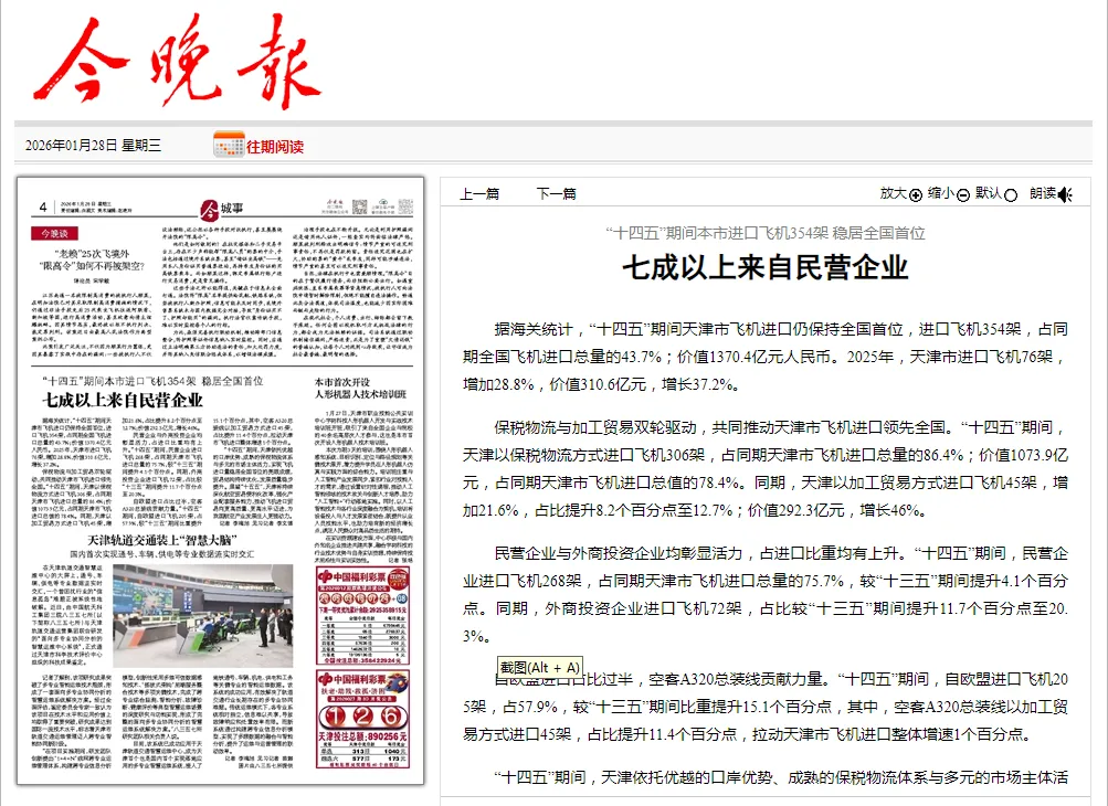 据海关统计,“十四五”期间天津市飞机进口仍保持全国首位,进口飞机354架,占同期全国飞机进口总量的43.7%;价值1370.4亿元人民币。2025年,天津市进口飞机76架,增加28.8%,价值310.6亿元,增长37.2%。