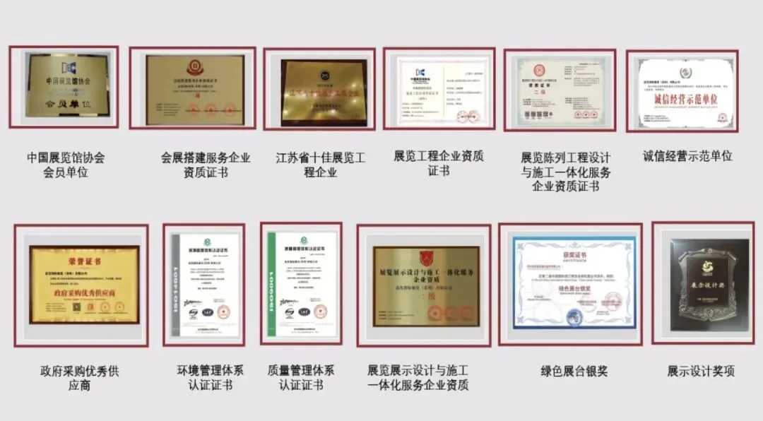 公司是中国展览馆协会会员单位 ,设计方案获得中国青年展示设计奖 ,江苏省十佳展览工程企业 。历年来公司所获得的荣誉离不开公司在行业内不断的深耕, 自我品牌价值的不断提升 ,只为更好的服务客户于 企业 ,让企业在体验会展之美的同时获得最大化的市场收益!