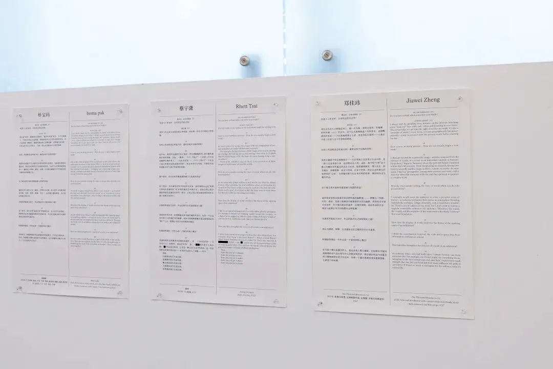 中间美术馆三层展厅正在展出“确立一场展览的基调(序章)”。在展览的前期策划阶段,策展人雅各布·法布里修斯(Jacob Fabricius)邀请每一位参展艺术家回答了有关创作的五个问题,并将这些问答作为展签集中呈现于三层展览入口处。延续了他在访谈著作《如何确立一场展览的基调》(中文即将出版)中与多位策展人的对话方式,雅各布希望通过聚焦“如何开启一件创作”,透视展览与创作的真正起点。这些回答并非提供关于艺术家的标准解释,而是鼓励观众以更自由的方式进入展览,思考作品如何奠定展览基调,并以自己的方式重塑和再策展观看路径。