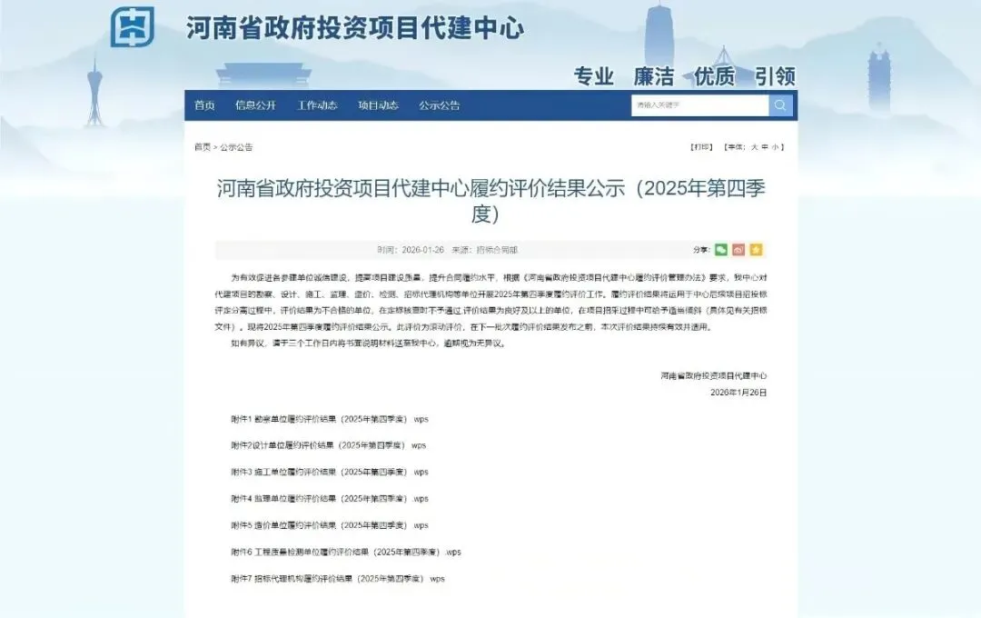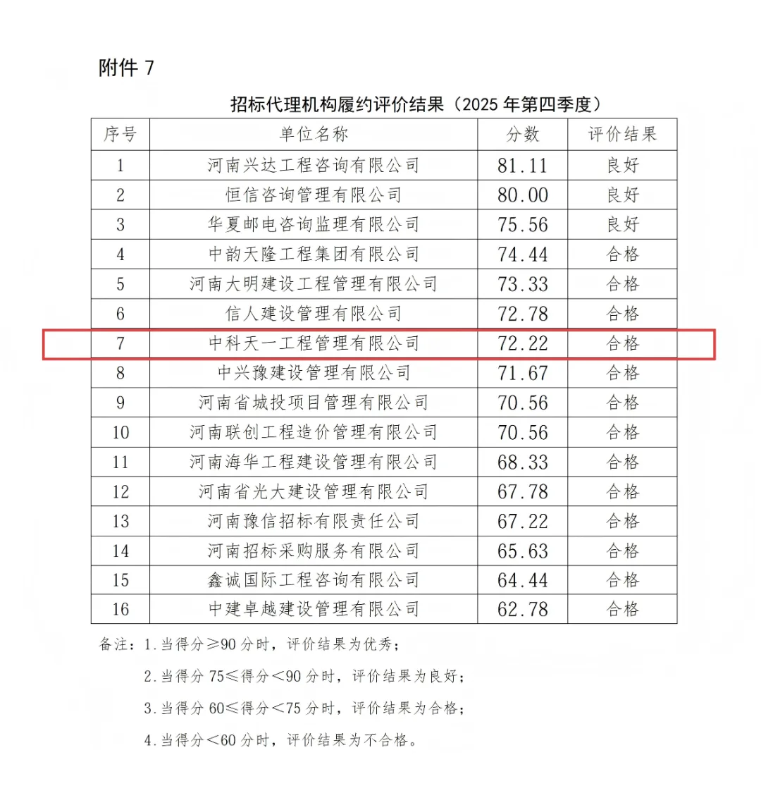 近日,河南省政府投资项目代建中心发布了“河南省政府投资项目代建中心履约评价结果公示(2025年第四季度)”,中科天一工程管理有限公司在招标代理机构履约评价结果(2025年第四季度)中名列前茅。