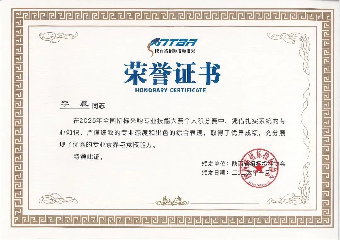 会议期间同步传来喜讯,凌辉公司招标代理事业部李晨在全国招标采购专业技能大赛陕西赛区中脱颖而出,以扎实的专业功底和出色的实操能力斩获全省前十的优异成绩荣获表彰。本次大赛是中国招标投标协会落实“人才强国”战略的重要实践,是对招标采购从业人员综合能力的全面检阅。李晨凭借日常工作中积累的丰富经验、公司系统化的专业培训支持,以及赛前的刻苦备赛,在政策法规解读、标书编制实操、风险防控处置等多个考核维度中表现突出,最终跻身全省前列。“这份荣誉既是对个人专业能力的肯定,更是公司人才培养战略落地的生动体现。”此次李晨获奖与事业部总经理参会,不仅展现了凌辉咨询在招标代理领域的专业实力,更彰显了企业作为行业标杆,在推动人才培育、引领行业规范发展中的责任与担当。