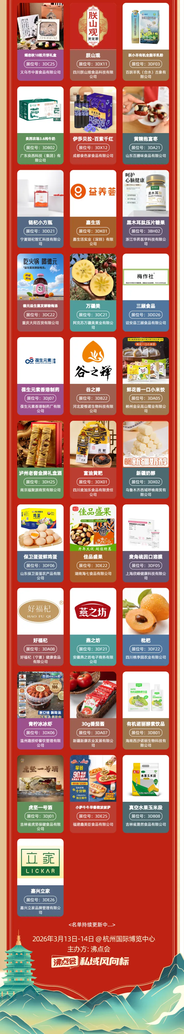 首批参展商名单重磅发布!本次展会覆盖食品、大健康、家居、美妆、服饰等私域核心赛道,国民老牌坐镇、源头工厂直供、新锐品牌突围,多方优质力量强势集结,聚力打响 2026 私域开年第一战!接下来,沸点会黎杰将带大家走进杭州沸点会 5 大展馆,全方位解锁参展品牌全阵容!