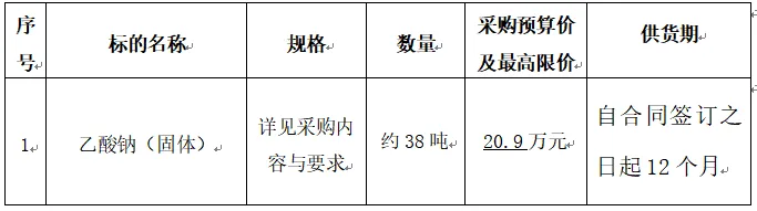 根据《衢州市国有企业采购管理办法(试行)》规定并参照《中华人民共和国政府采购法》等有关规定,衢州市城投工程咨询有限公司受衢州市扬清环保科技有限公司委托,现就衢州市扬清环保科技有限公司乙酸钠(固体)采购项目进行公开招标,欢迎合格的投标人前来投标。