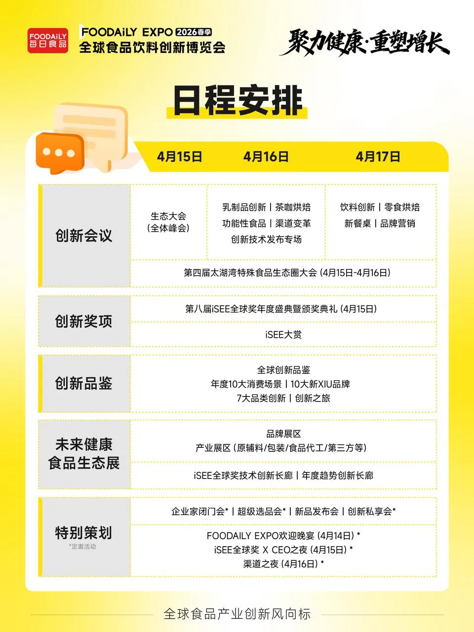 以“创新会议+创新品鉴+创新奖项”以及“未来健康食品生态展”为核心,2026 Foodaily创新博览会将全方位融合产业顶层思想、全球创新灵感与标杆品牌案例,为参会者呈现全球视野下的食品健康化、功能化系统升级全景图。